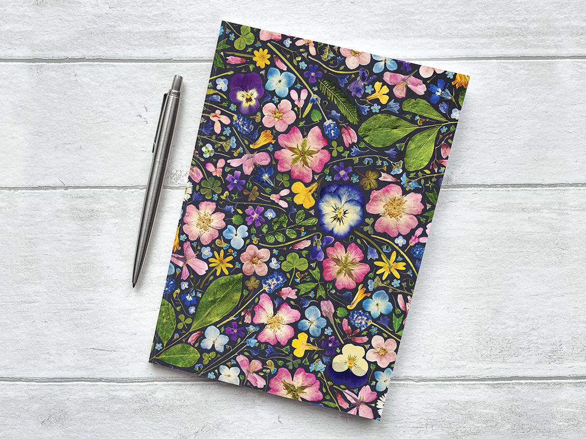 | Capture your thoughts and inspirations in this beautifully designed notebook, featuring a delicate pressed flower design. With 76 lined pages, it's ideal for bringing a touch of nature to your workspace, packing in your bag, or keeping on your bedside table for late-night journaling. Cover material: 300gsm recycled card cover Page material: 90gsm recycled paper, 76 ruled pages (or sides) Binding: The spine has a square appearance and is stapled in two positions to secure the pages Size: A5 (148 x 210mm) Designed and printed in the UK |