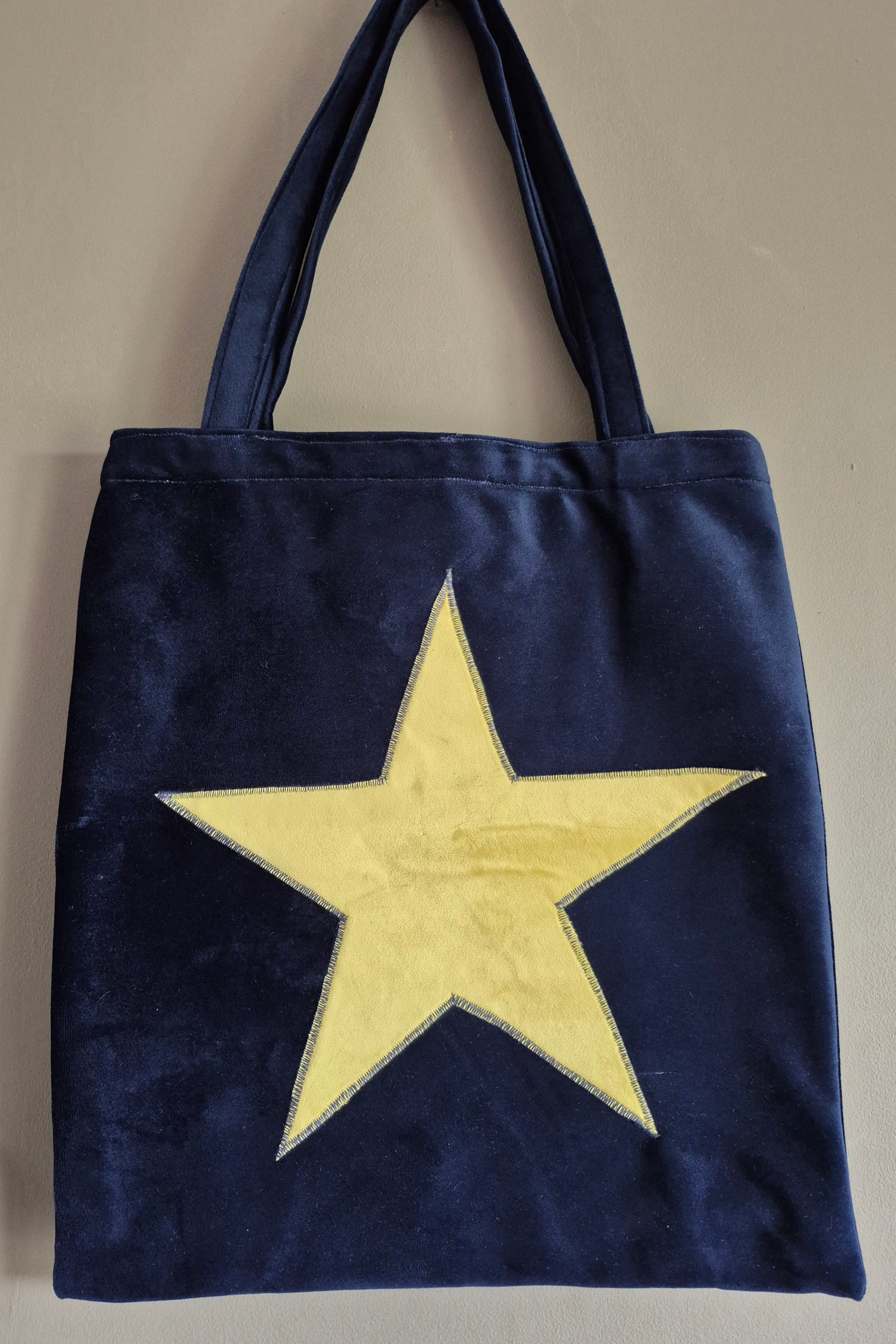 Handmade from luxury soft navy blue velvet with a lemon yellow velvet star sewn on , this bag is perfect for everyday use or from gym to beach.