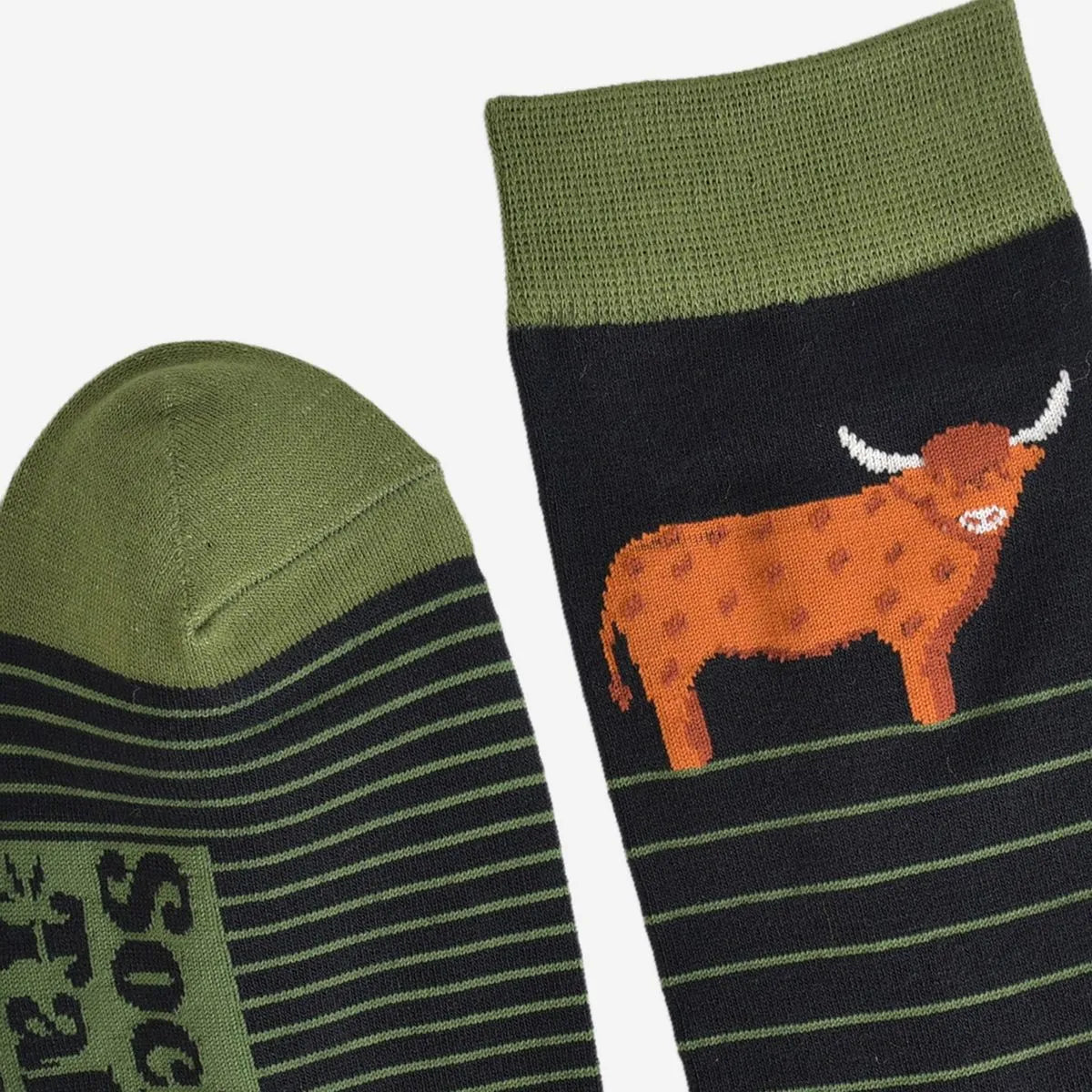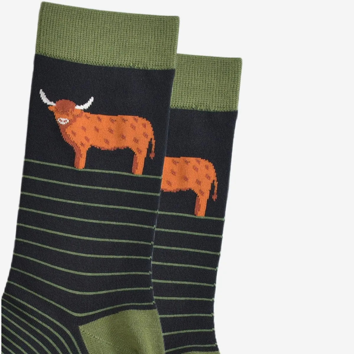 Men's Bamboo Socks - Black/Green, Highland Cow Stripe