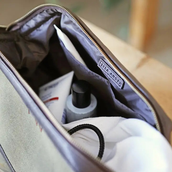 With khaki-coloured canvas making up the majority of the wash bag, the top and bottom are finished in brown faux leather.