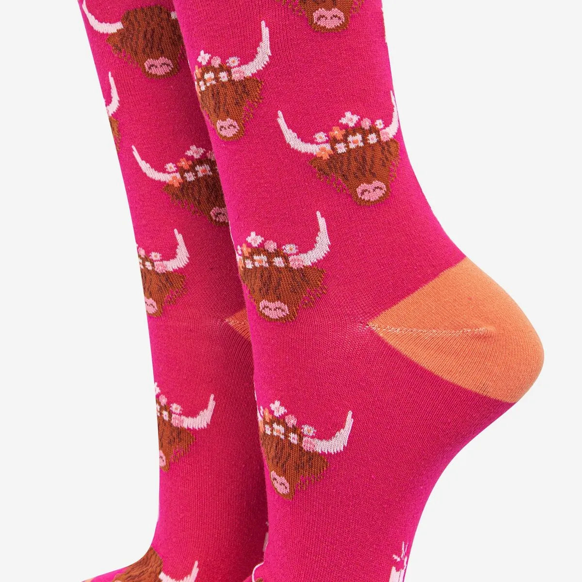 Women's Highland Cow With Floral Crown Bamboo Socks in Pink Orange