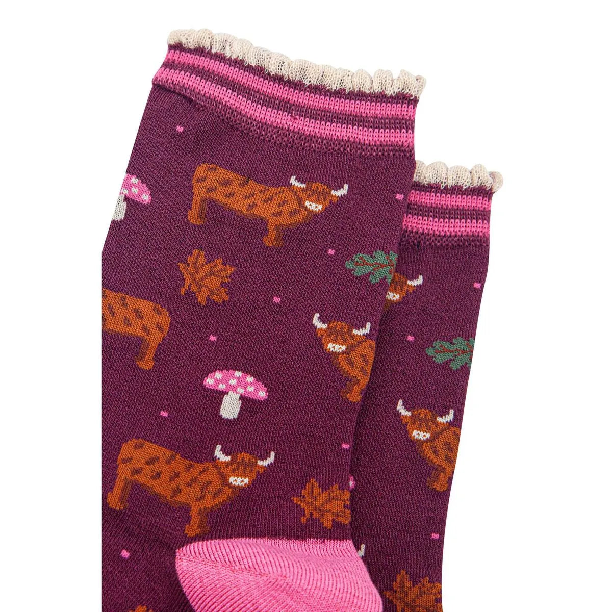 Women's Bamboo Socks - Berry/Cream, Highland Cow Toadstool