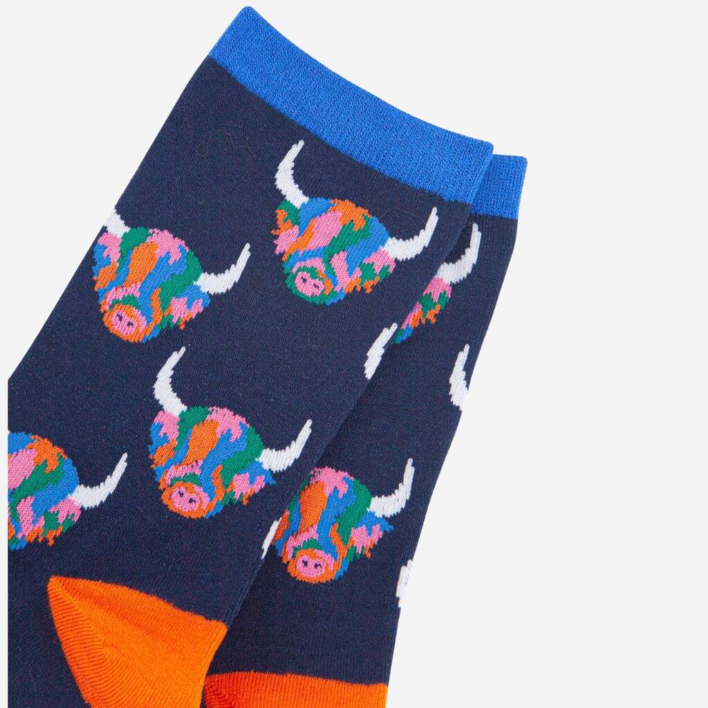 Women's Rainbow Highland Cow Print Bamboo Socks in Navy Blue